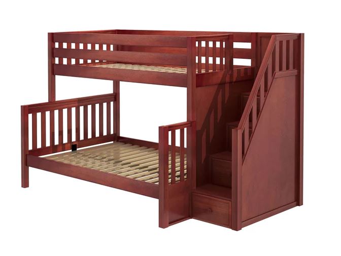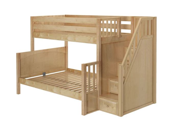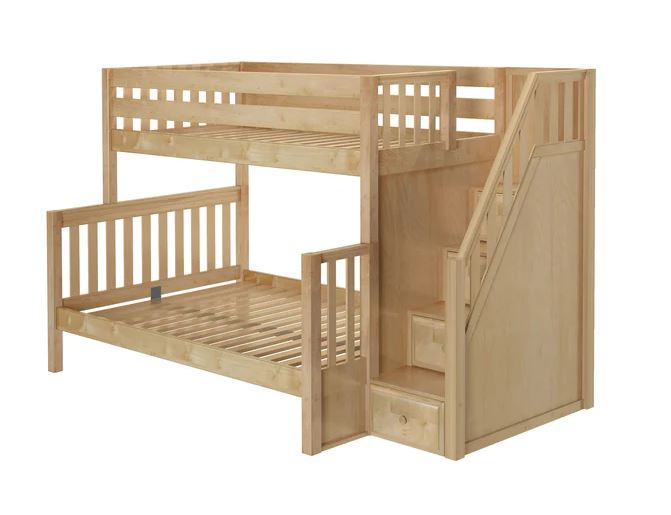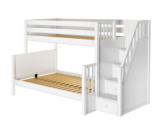 Sleep different sizes and ages comfortably in our twin over full bunk bed with stairs! Full size bed as bottom bunk = extra space for snuggling, sleepovers or adult guests. Staircase is a safe way for young children to climb into bed, plus each step doubles as a storage drawer. A Maxtrix Kids best seller.