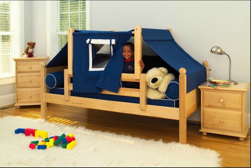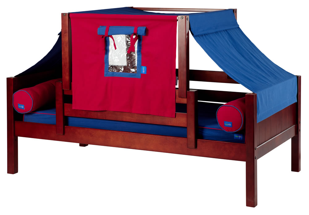 Transition your toddler out of the crib and into our adorable daybed with top tent. Front and back guardrails keep little ones super safe + secure. Colorful fabrics create a cozy space for both sleep and play. The perfect first bed, but easily converts as your child grows so you can use for years to come.