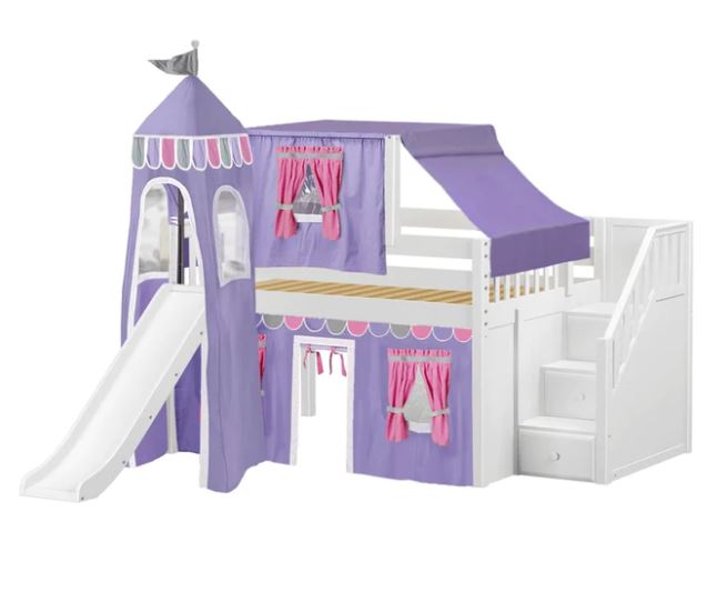 Colorful fabrics and slide turn the classic Maxtrix low loft with staircase into a castle bed fit for a prince or princess. Steps are a safe way for younger children to climb + double as storage drawers. Full size = extra room for growing kids, sleepovers or snuggling.