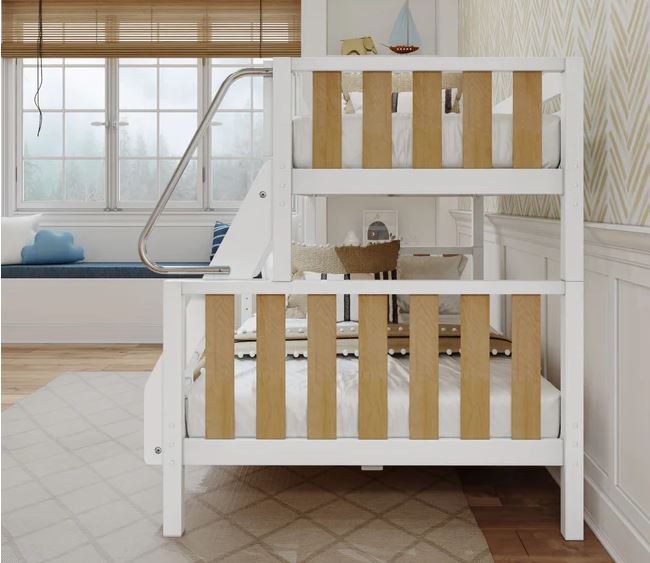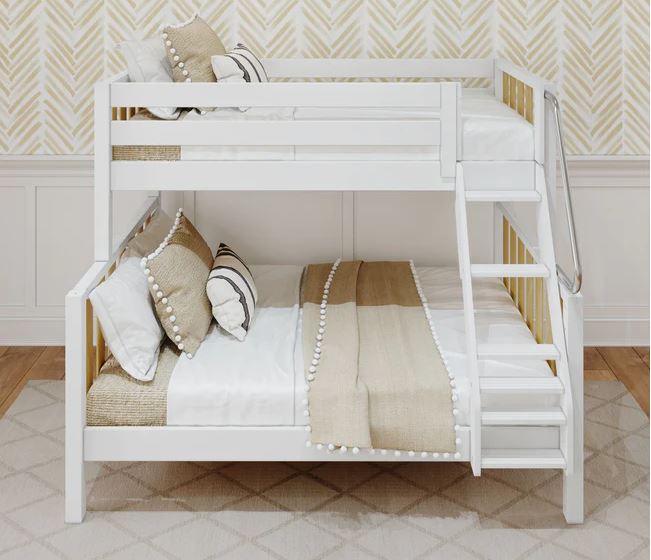 The stylish way to sleep more, our new Modern Twin XL Over Full XL Medium Bunk Bed with Angled Ladder is perfect for shared spaces. Part of our new Modern line, this bed combines white and natural wood to create a warm, two-tone design that matches perfectly with your neutral furniture and room decor. With a full xl-size bed on the bottom, this bunk bed has plenty of space for kids, teens, and adults to stretch out and snooze. This heavy-duty bunk bed can support up to 2,000 lbs. per sleeping surface, while tall 16-inch guard rails on the top bunk keep sleepers safe and secure. The angled ladder has wide, grooved steps and a removable handrail to make climbing into bed easy.
