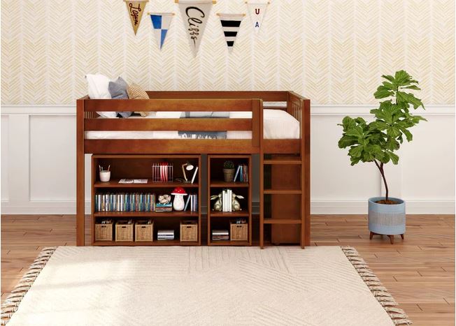 Sleep and store in style with our Twin Library Low Loft. Designed for sleep and storage, this loft bed is great for small spaces. This loft bed features 3 underbed bookcases with 3 open shelves to display and store all your everyday items.