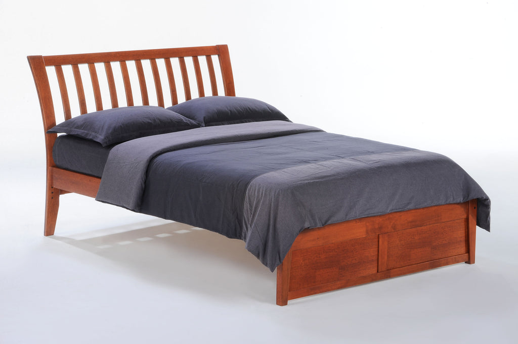 The Nutmeg Bed is a great choice for the contemporary room. Its flared legs and curved-slat styling is a current classic is reminiscent of a sleigh.